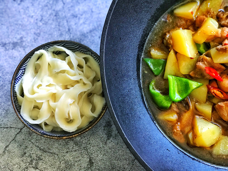 大盘鸡炖煮到最后还会有不少的汤汁,在饭店一般都会先吃完菜,再煮一些宽拉面当主食,在家做我也是买了一点宽拉面,先把炖好的鸡肉和菜捞出来,剩下的汤汁煮了够一家人吃的宽面条,这样荤素、主食全有了。冬天的时候可以一家人围在一起,大盘鸡用火锅开最小火,一直像吃火锅一样热着锅吃,等鸡肉和菜吃的差不多啦,在锅中适量的加一些高汤或者开水,把面条放进肉汤中煮熟,然后捞出面条再浇一些汤汁一起吃,就这样吃饱喝足了。