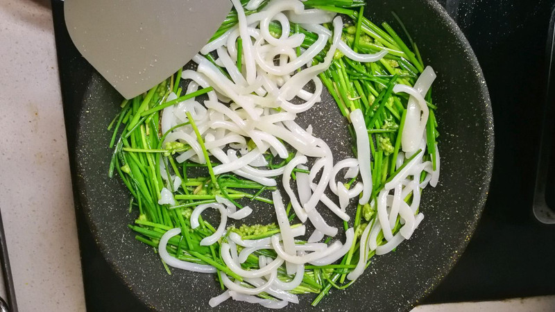鱿鱼用水焯过之后不宜翻炒时间太长,会让鱿鱼变得绵韧,就没有Q弹鲜嫩的口感了。