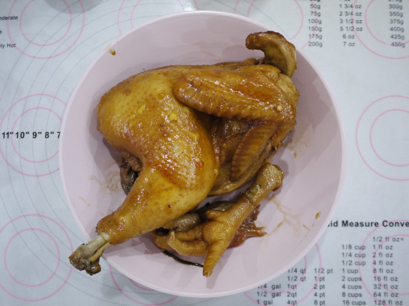 1、在鸡身上抹生抽和老抽时,鸡表面要干爽,水分太多不易上色。