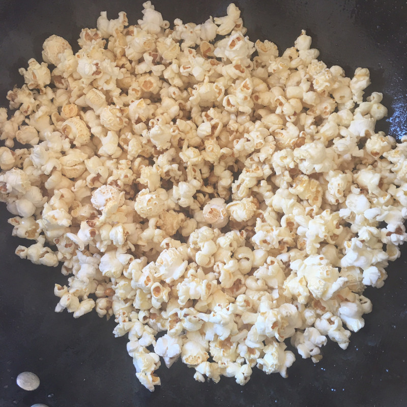 放黄油不能抠,油要比玉米粒多,糊了会发苦。爆米花的过程中,是电磁炉就用小火。液化气灶用中火,锅离灶高一点,时不时晃动一下避免糊了,动静不大时关火,利用余温继续爆,刚关火不能开锅盖,小心别被还没爆的玉米粒“攻击”关火不及时也会糊喔。这是一款需要盯着火候的小零食。