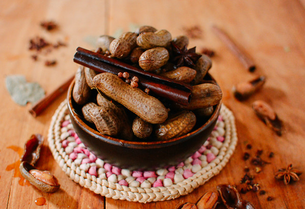 除了要选用新鲜优质的生花生,还要按配比选用各式香料:盐、花椒、肉桂、月桂、八角。