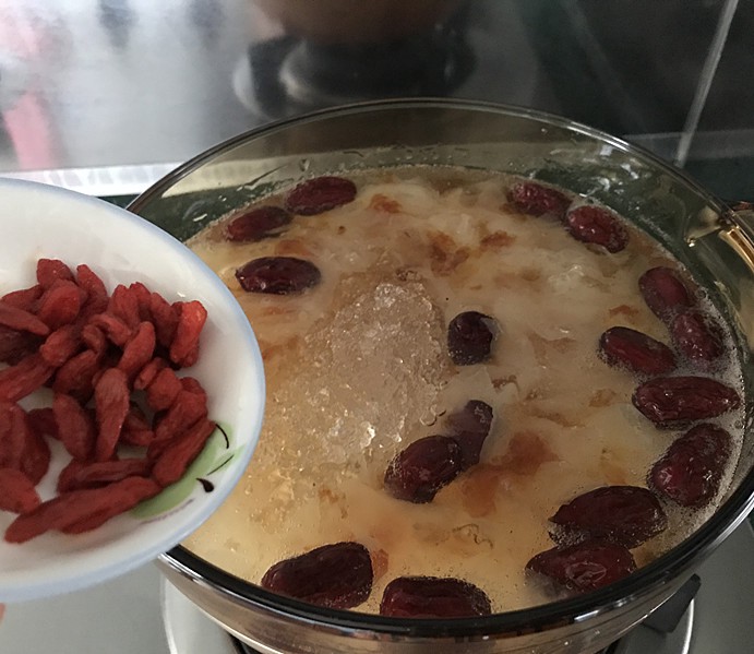 4、雪燕和枸杞切记不要早放,雪燕炖久了会化成水,枸杞炖时间长容易发酸,影响食用的口感。雪燕分:拉丝和不拉丝两种,我这种估摸着是不拉丝的;自己买最好选拉丝的,更有燕窝的感觉。