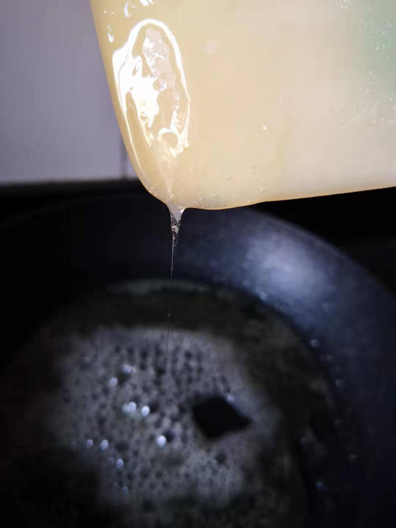 2、 糖要小火熬到很多密集小泡有少许拉丝状,熬过或没到位,最后的糖霜就不是沙沙的,就不会有入口即化的口感。