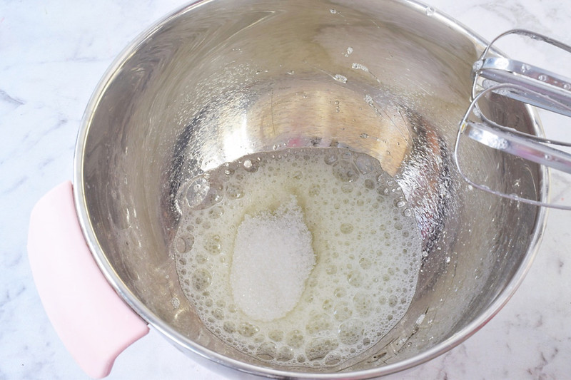 打发至硬性发泡,就是提起打蛋头有小尖角即可