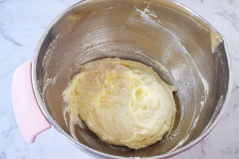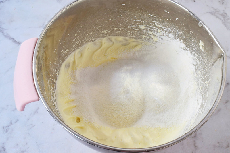 再将翻拌的面糊取一小部分放到牛奶和玉米油的混合液中