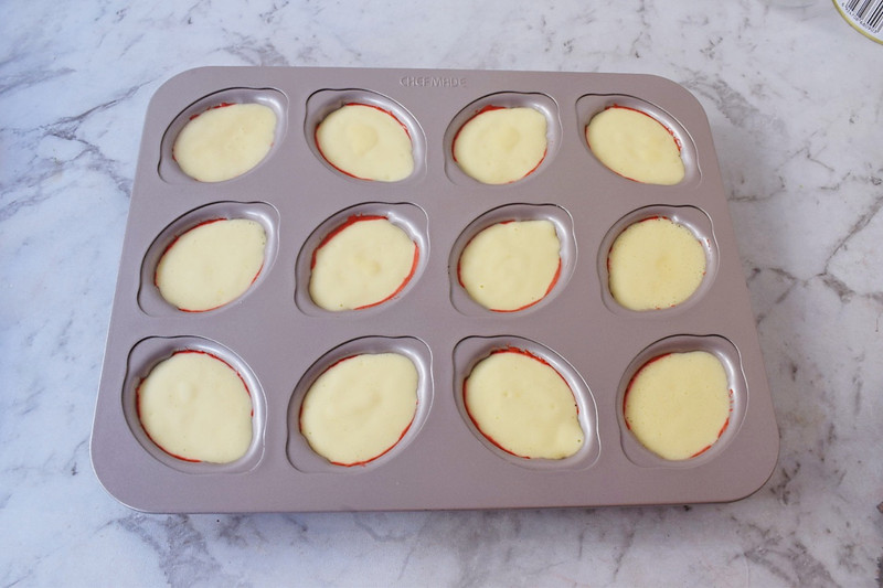 先取红色的蛋糕糊挤在学厨的瓢虫蛋糕模具的翅膀部分,如图所示