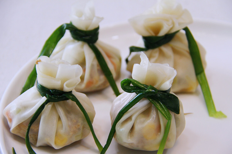 4、做好的五彩福袋因为馅料和皮都是熟的,可以直接吃,也可以重新蒸热再食用,搭配其他酱料一起吃,口感更丰富哦,祝大家都福气满满哦!