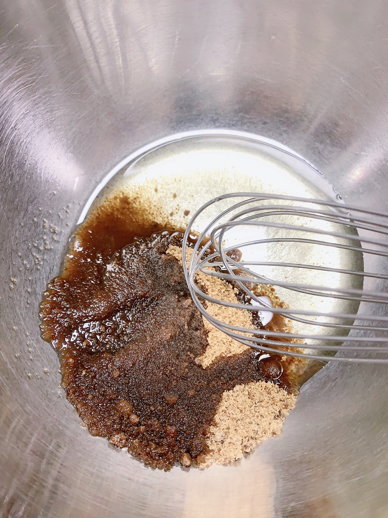 将红糖加入色拉油中,拌匀。如果红糖颗粒较大,需要隔水将红糖融化,但是一定要记得冷却。