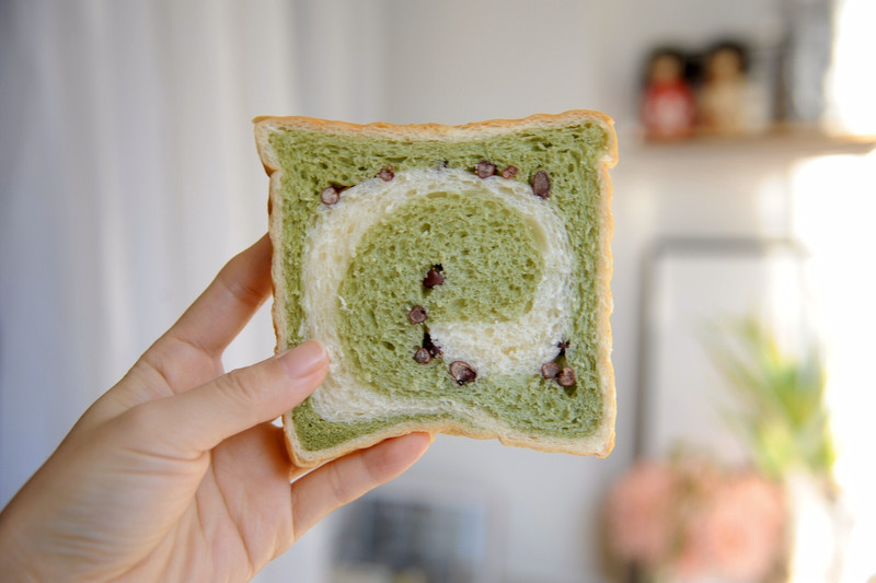 双色吐司养眼又好吃,像个绿色的旋涡,加了蜜豆就更加馋人了.口感清新带点甜,浓郁的奶香味中夹带着茶香,香而不苦涩,百吃不腻.