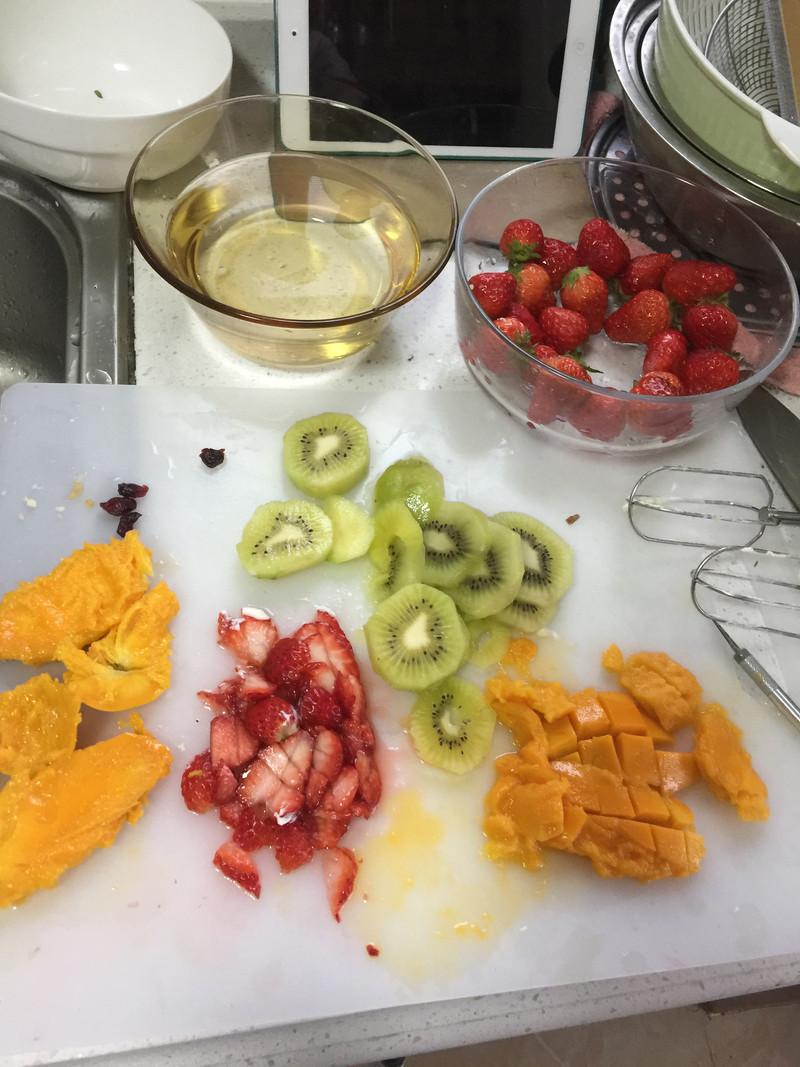 1、打奶油不需要冰敷,保持打蛋器以及容器无油即可,因为买来稀奶油就是放在冰箱里,这个温度拿出来足够了。开电动打蛋器打3分钟左右,分3次加入砂糖。有清晰纹路,小尖角,盆子倒扣,奶油不会流动、掉落。不要打过头。2、稀奶油不适合裱花。3、装饰的水果可自由发挥。