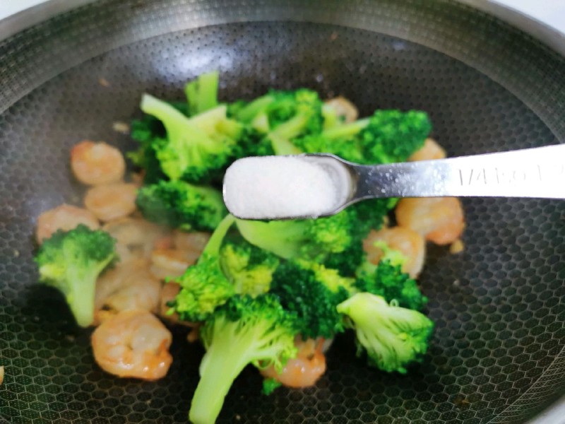 5.加入西兰花,加一勺盐,一勺耗油翻炒均匀即可