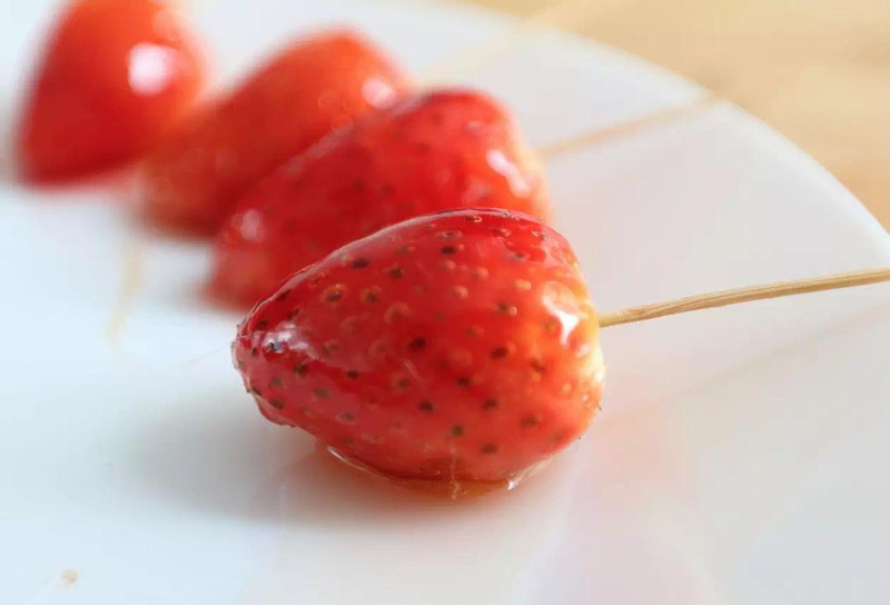 我是把草莓切成小块,穿在牙签上的,也可以直接用竹签穿整块的草莓啦!
