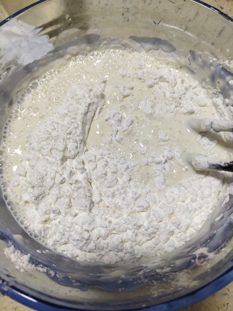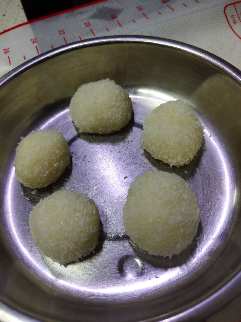 熟糯米粉:糯米粉适量放不粘锅炒到微黄就可以用了,记得一定要小火炒。雪媚娘要用到熟粉,椰蓉的直接粘椰蓉就可以了