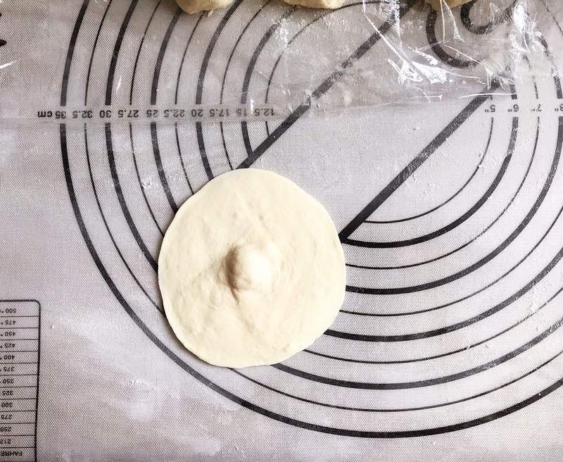 面板撒少许干粉,把面团分成等份剂子。分好的剂子用保鲜膜盖住,防止剂子水分流失,变干。