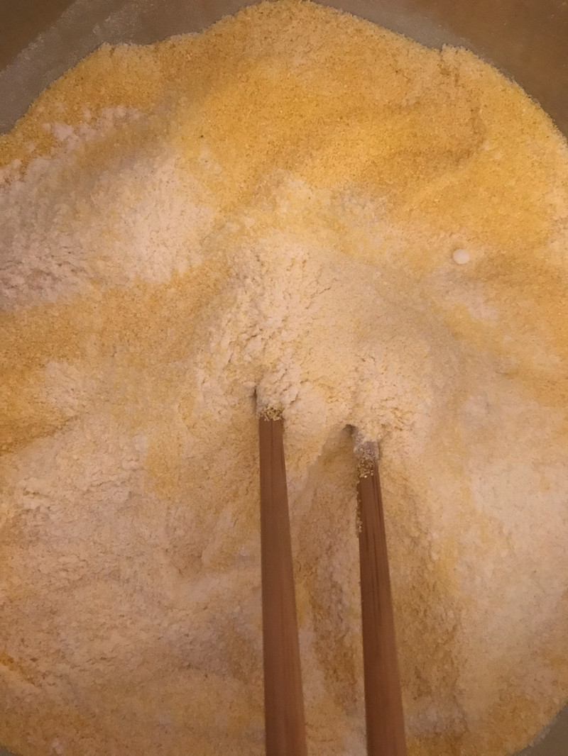2.嫌麻烦的可以直接面粉玉米面白糖酵母直接混合,倒入牛奶搅拌~并不会有太大影响
