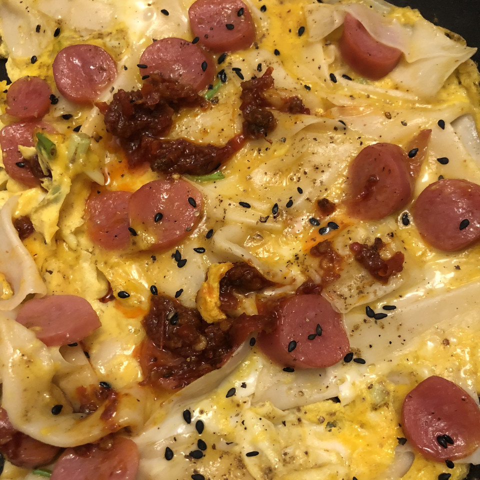 袋装的魔芋面在网上有卖的,如果觉得不好加起来可以提前帮它剪成一段一段,这样就可以整块整块的吃了,现在我没有间断,那他是一条一条的也是很不错,酱料是这个蛋饼的灵魂放入你们喜欢的调料试试看吧,中国式披萨又像是魔芋面铺蛋又有点像烤冷面。