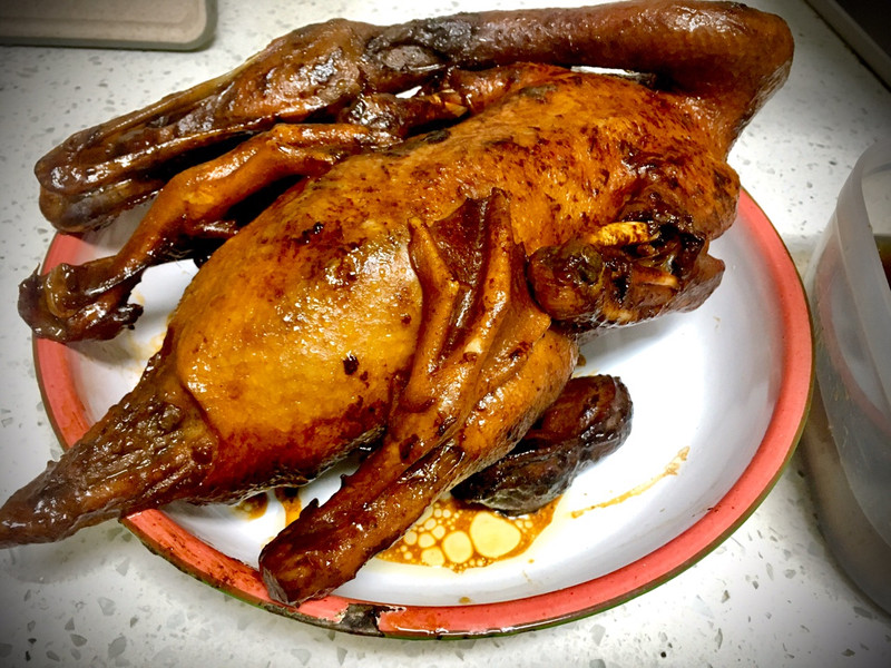 判断鸭子是否熟透的方法是拿根筷子往鸭腿和鸭胸处戳下去 能轻易戳进去又没有血水渗出来就熟了