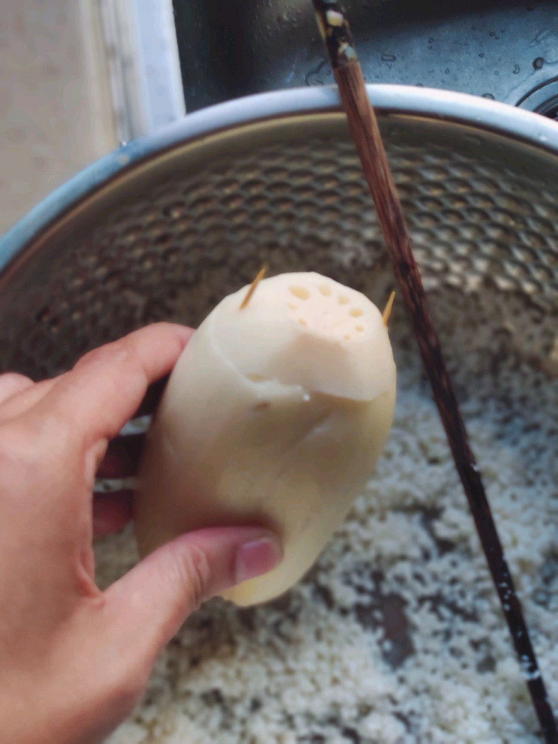 糯米泡好后,建议把水滤干。太湿糯米不好塞入藕洞。
