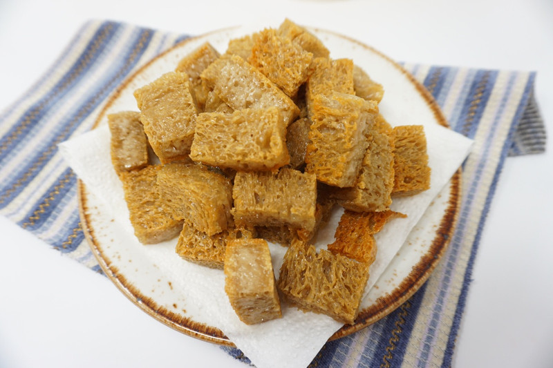 炸到金黄之后捞出控油,可以垫一张厨房纸吸油。这个时候如果你觉得烤麸炸的太硬了,不要慌!是正常的!!一会儿捞汁闷的时候就会软下来,炸的比较硬一些可以多带一些嚼劲。 (炸完烤麸的油不需要倒掉,一会儿炒菜的时候可以用,如果还剩很多,或者觉得太多了,可以倒掉一些)