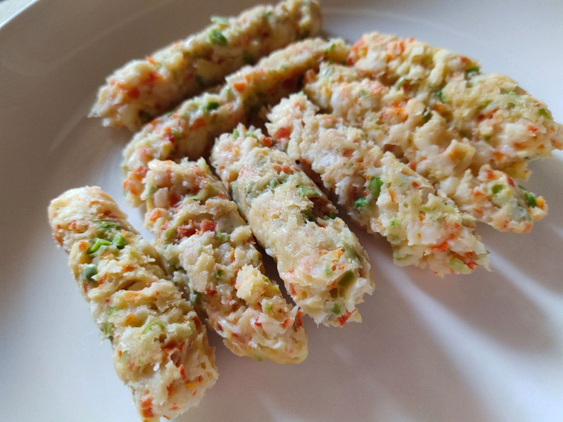 宝宝八个月了,可以加两次辅食了,可是米粉感觉有点单一,宝宝没有以前爱吃了,现在可以开荤了我就选择了虾肉蔬菜肠,没买模具用的锡纸,有点丑,不过宝宝很喜欢,明天又上班了,做好冻起来备着。