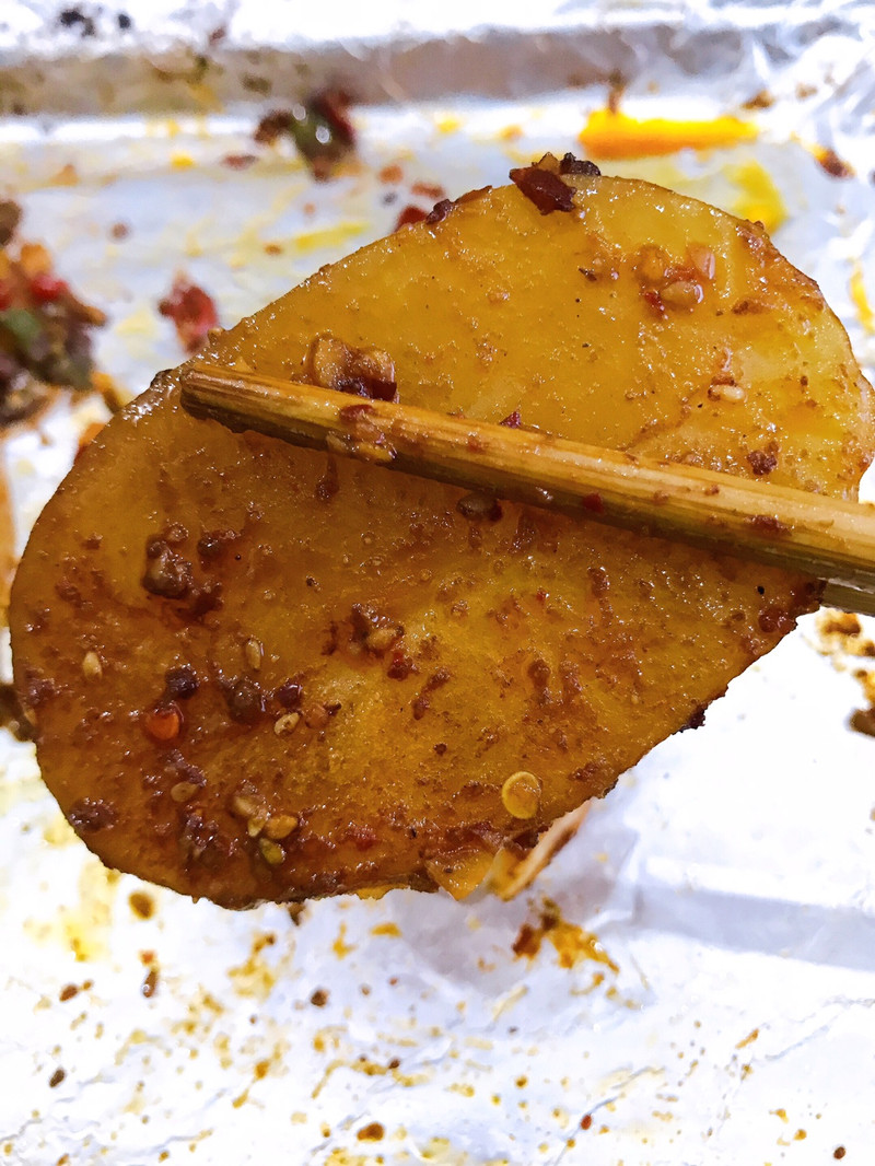 2. 入烤箱前可以再撒一些辣椒粉、孜然粉还有芝麻,烤好后会更香