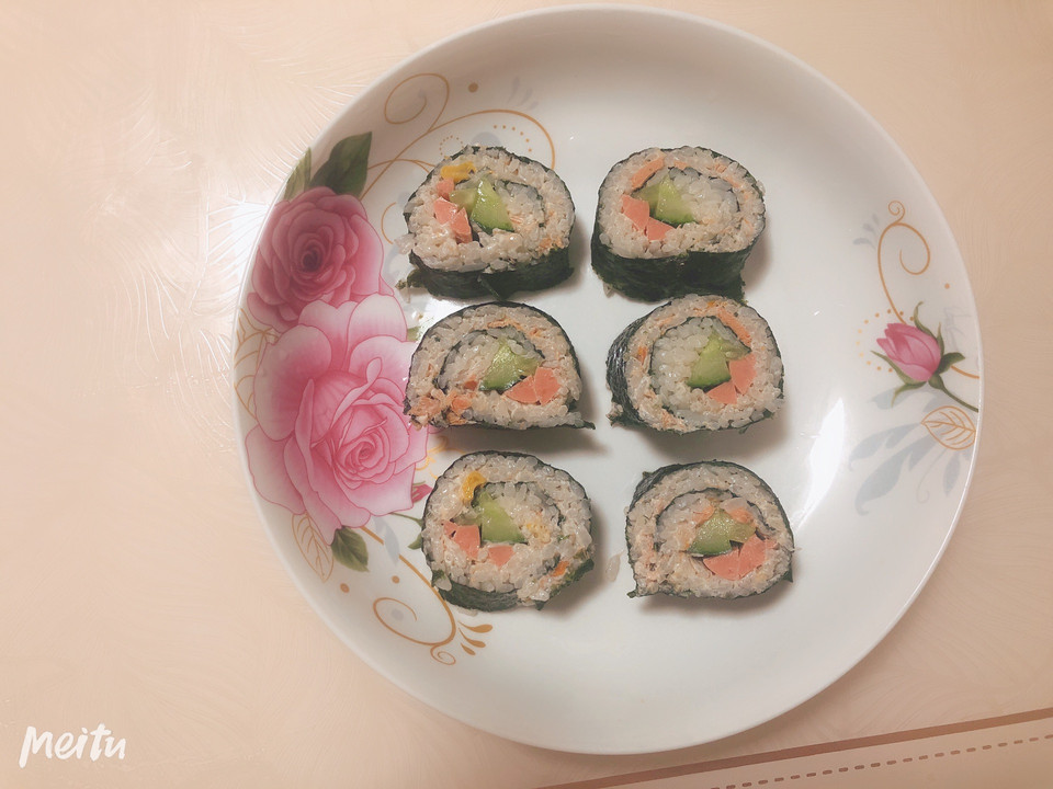 米饭放在紫菜卷上不要太满,薄厚要适中,太薄太厚都不是很好.放入番茄酱味道更佳!
