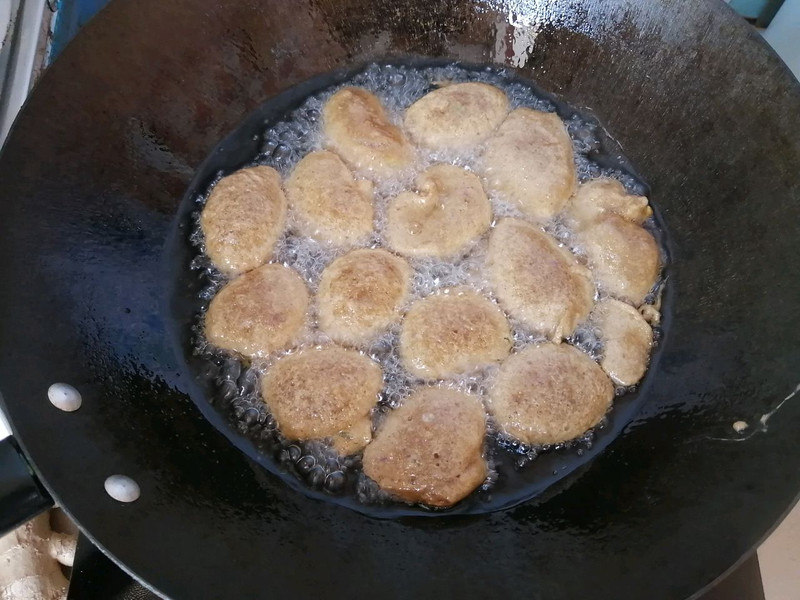 4.炸米果切记用中小火慢炸,一般5分钟差不多了,记得翻面,以防止一边熟一边不熟