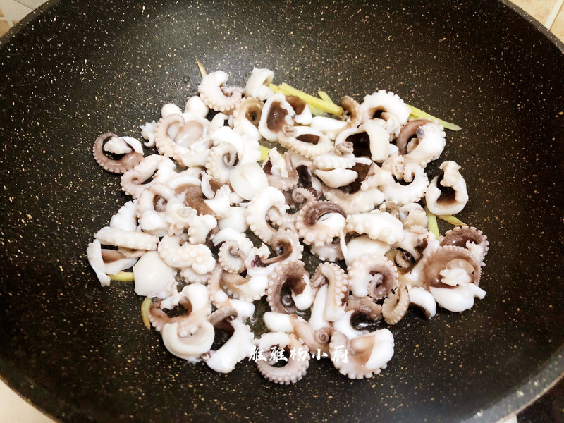 鱿鱼须焯水的过程不能太久,炒的过程要用大火快速翻炒,不需要盐,酱汁中的咸度刚刚好
