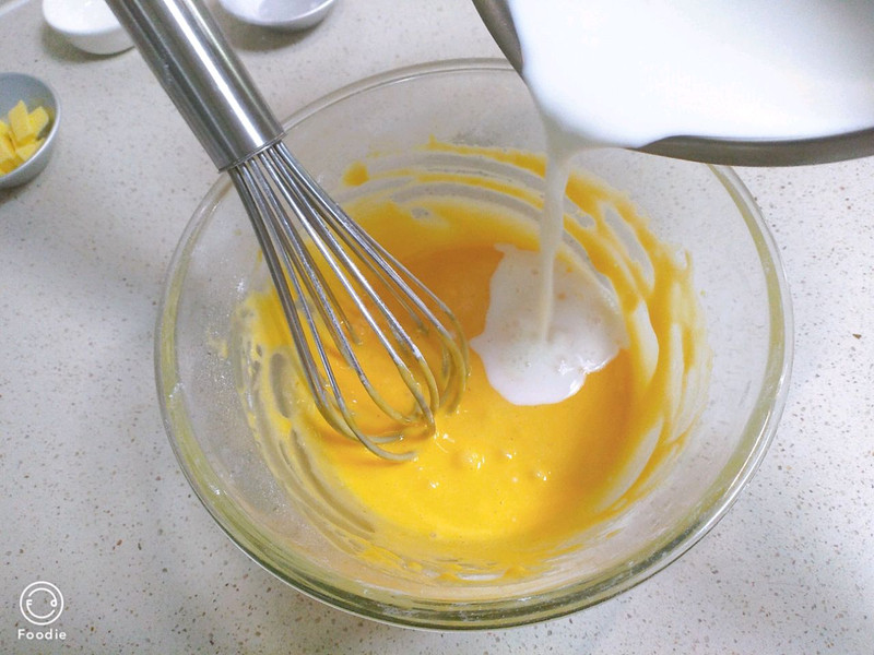 2.牛奶和蛋液必须是温热的才好融进麻薯粉,冷的不容易融合哦~
