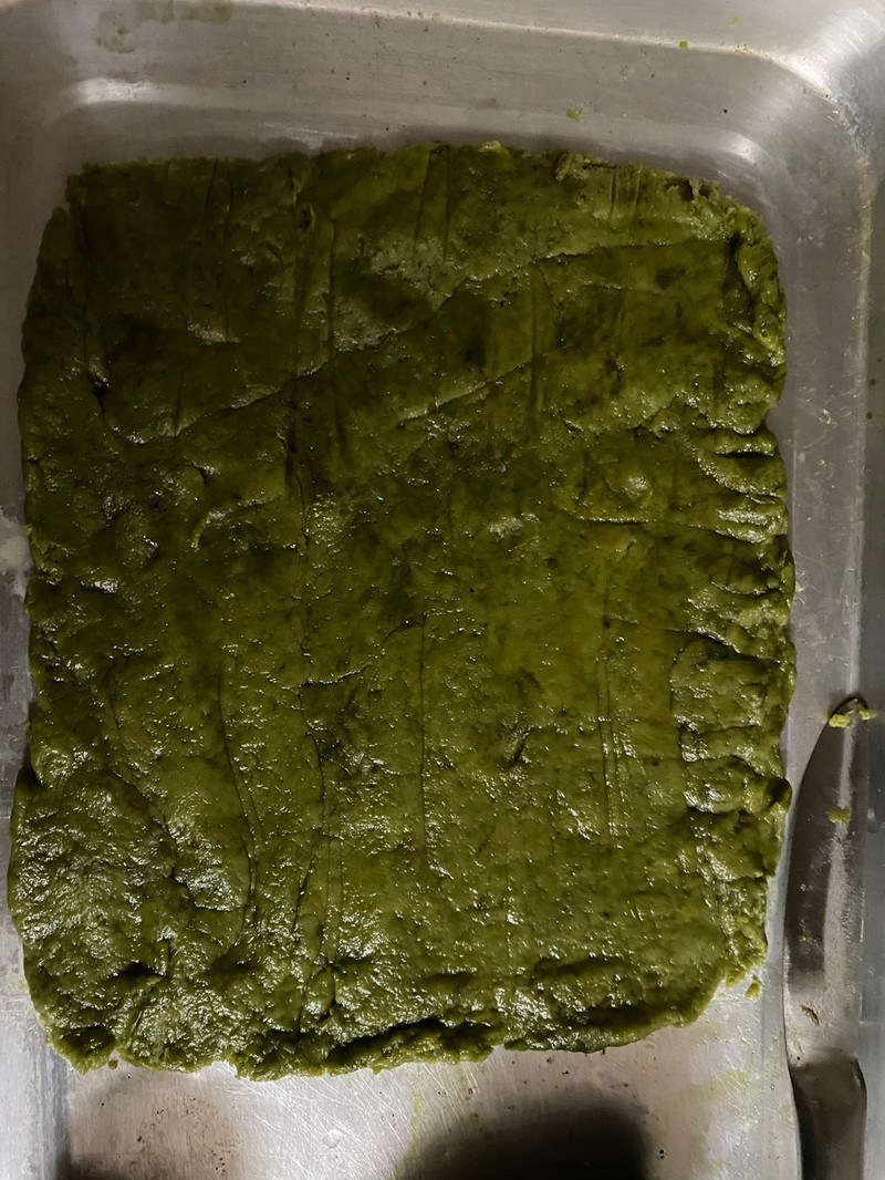 把它放置在一旁,然后我们开始弄中号的抹茶面团,也是把中号的抹茶面团用木棍揉搓成一个方形。