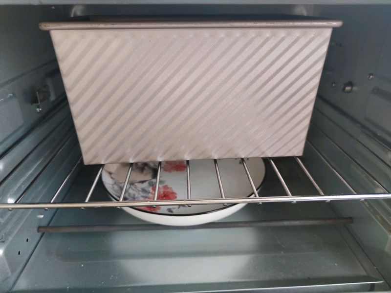 烤箱中放盘热水,将模具放入烤箱中,发酵至8分满