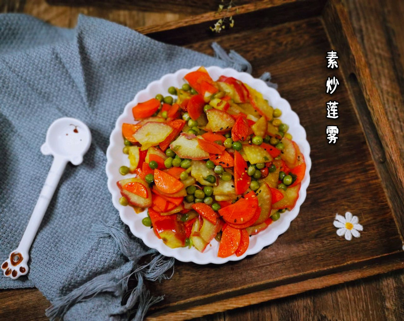 因为胡萝卜和青豆都用热水焯过 所以炒制时间不要太长 特别是莲雾片入锅后翻炒均匀即可