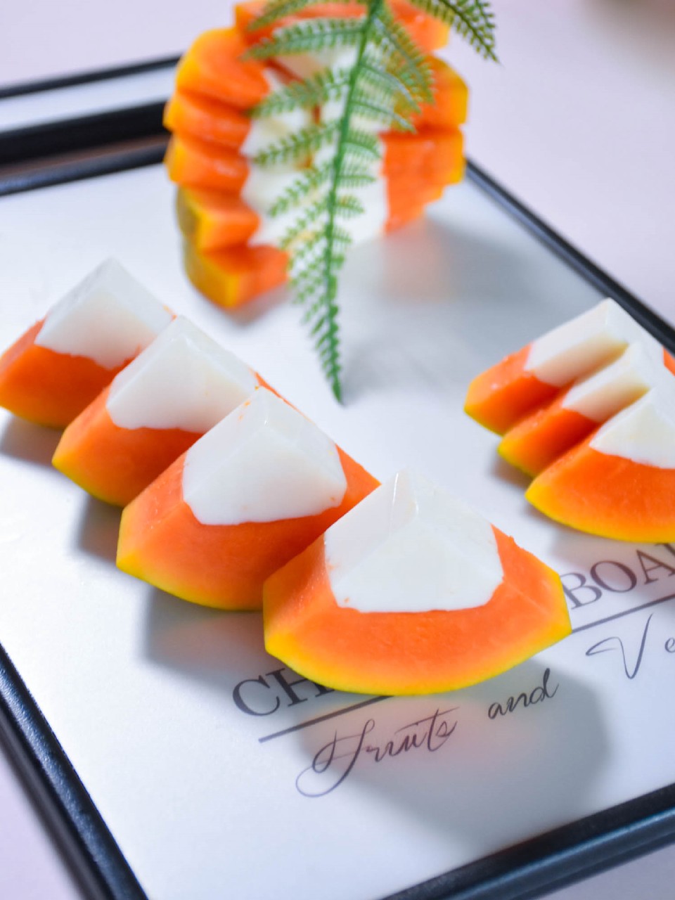 往木瓜里倒牛奶时,可用辅助物把木瓜直立。
