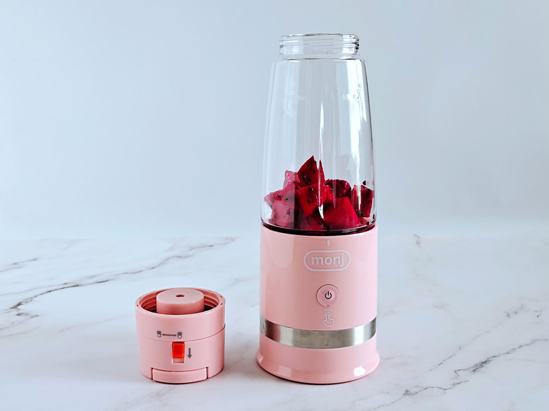 水果部分可随个人喜好替换成其他的,比如用香蕉,苹果这些容易氧化的也没关系,把MONJ真空便携榨汁杯拉环上提7—8下抽成真空,这样打出的果汁就不会氧化了,非常的简单方便!芒果花片帖在杯子里要轻轻的按几下使之更加的服帖。