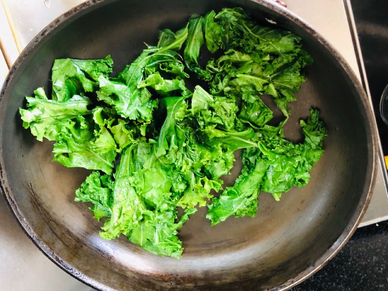 羽衣甘蓝试过很多处理方法,用煤气在锅里烘软最理想,但是我们不能烤的太熟了,稍微变软即可~