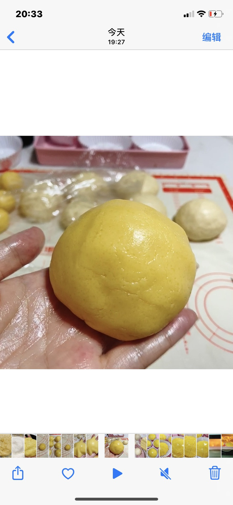 从冰箱取出酥皮面团,揉成条。分成均匀的等份,揉圆,底部放一张保鲜膜,把酥皮面团放上去,再盖一箱保鲜膜。