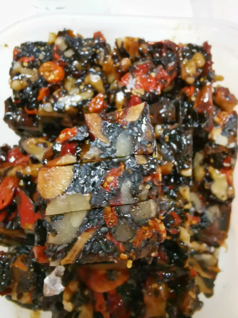 2.熬好的阿姣超级粘,我怕不好脱模,垫上铝箔,才发现是个大错误。太粘了,铝箔一撕就破,没办法就一起切片,每次吃的时候再一点点撕掉。可能模具多刷点油也能脱模。