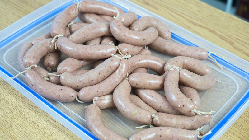 7、灌好的香肠最好晾晒在阳台内,或悬挂于室内通风处风干,避免太阳直射,放冰箱冷冻保存,随吃随取非常的方便。