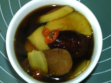 立马就行动起来,大枣太大,只用了两颗,干硬难切,也还是勉强划拉成几片。苹果懒得去皮,曾有某节目说苹果连皮煮更有营养,这正好成为懒人的借口。