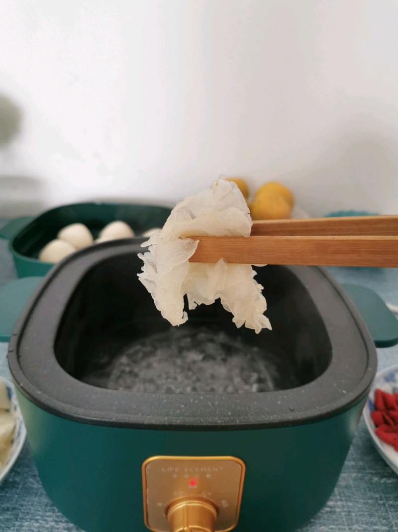 1、银耳提前泡发。这个甜羹的蒸煮时间随个人喜好,想吃软烂一些的就多煮一会。