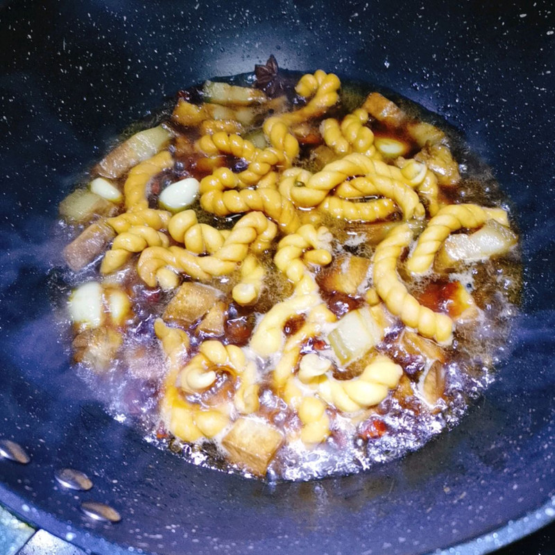 小时候假日在外婆家,就吃到了红烧肉煮麻花这个菜,当时就抢着吃麻花,那个味道棒极了,一直没忘。