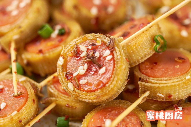 用张豆皮将香肠卷实了,然后隔空插上牙签,再用刀切开。