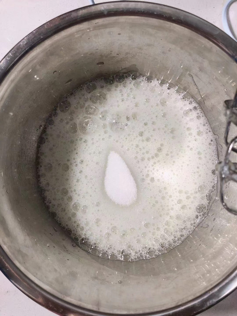 做烘焙一定要学会控温:天热蛋白一定要放冰箱冷冻出一圈冰渣才用,秋冬也一定要用冷藏的鸡蛋磕出的蛋白。我此刻室内温度22度左右,不需要冷冻,蛋白里一定要加几点白醋或柠檬汁,可以保持蛋白稳定,开打蛋器中低档打到图中这个样子(鱼眼状)加入1/3细砂糖。