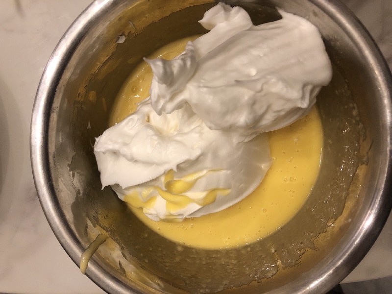 把刚才翻拌均匀的蛋黄糊全部倒入剩余蛋白霜中,