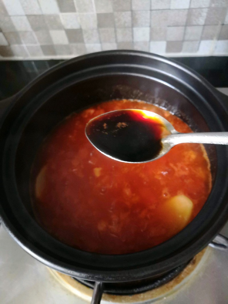 加入一勺生抽,半勺蚝油,适量盐,一勺白糖,一勺番茄酱翻炒调味,倒入小半碗清水,中小火煮开。