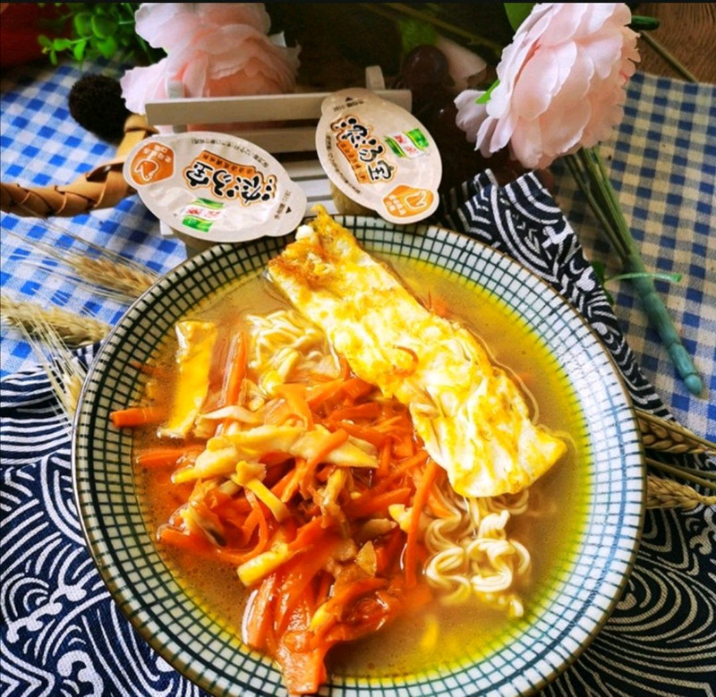 今天的早餐做了一个红萝卜海鲜菇蛋清面,只是简单的用红萝卜和鲜菇切成丝,蛋清煎熟,把水煮开后,加入浓汤宝,下面饼煮熟就可以!做法虽然简单,但是因为加入浓汤宝,即便是最简单的水煮面条也吃出了五星级大酒店的味!