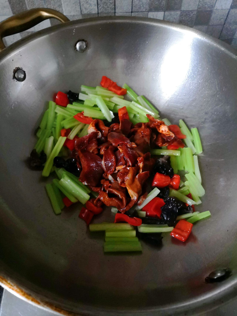 2、由于鸭胗腌制入味,最后出锅前只需加生抽,鲜鸡汁调味即可,不用再另外放盐了。