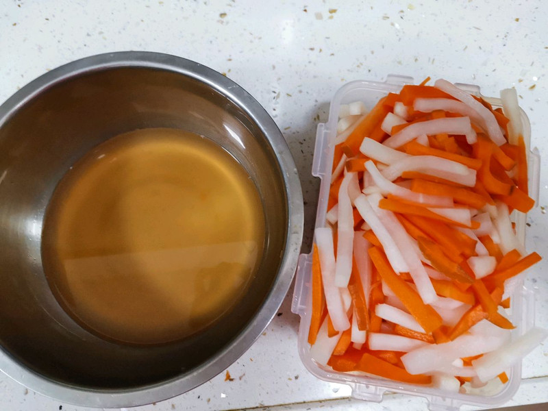第二遍用白糖腌这样萝卜会更脆,沙出的水不要倒掉,直接加进醋汁,要没过萝卜。