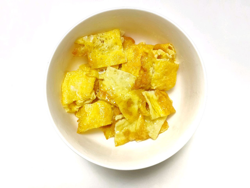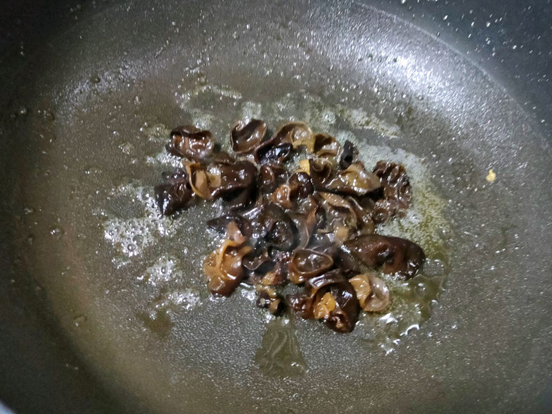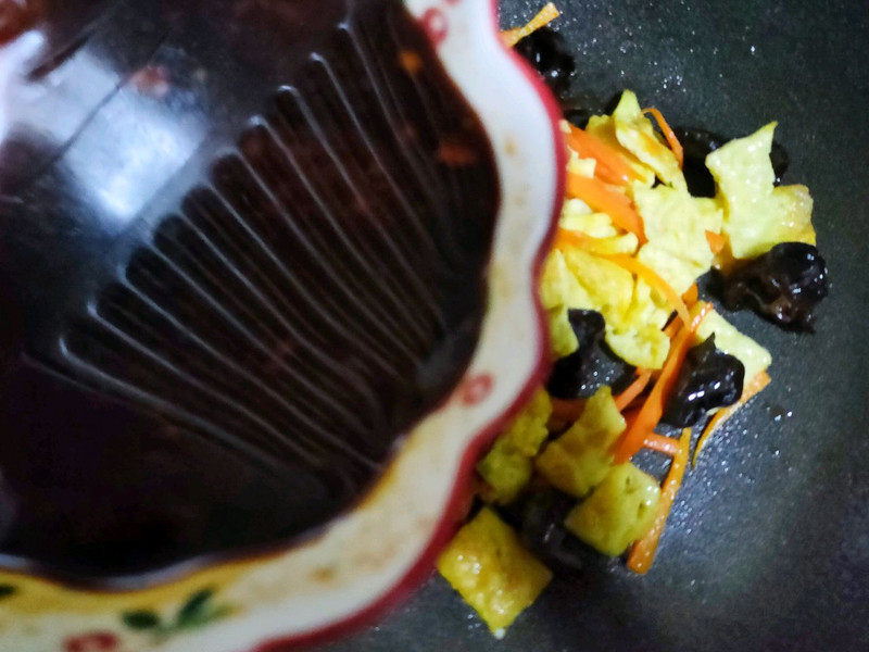3.鸡蛋打散入锅煎熟切块备用,锅中热油倒入木耳,胡萝卜丝翻炒至断生,倒入鸡蛋块,淋入酱汁加少许盐煮至浓稠撒上葱花装盘。