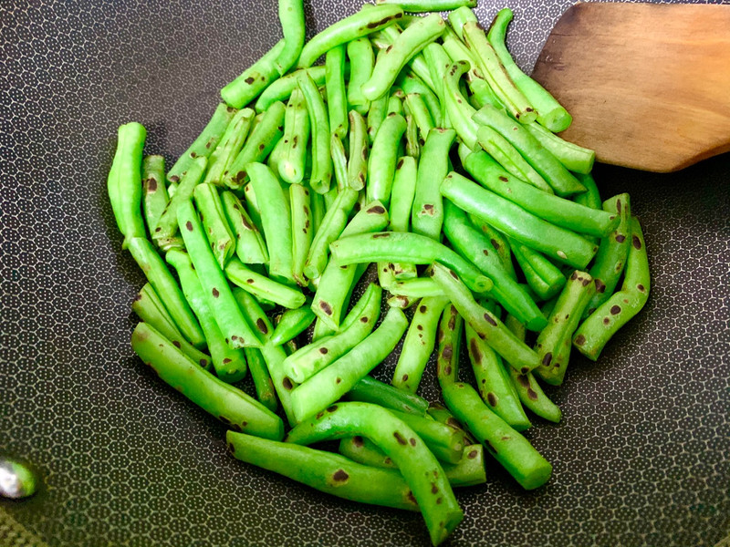 注意煸炒四季豆、火候不能太大、不然菜没有熟、外皮过于焦!四季豆要炒熟、不然要中毒哟、就会“啊”、さようなら(sa yo na ra )了。